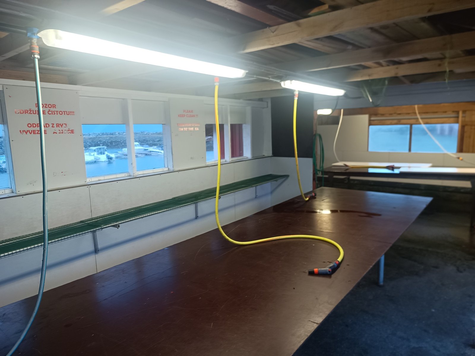ÚčastníkFujavice zatím neskončily. Zrenovovali jsme most na molo,zkulturnili filetárnu, vyčistili mrazáky a připravili další lodě na odvoz. Večer opět grilovačka a výroba salátu. Zítra se snad po dlouhé době dostaneme na moře