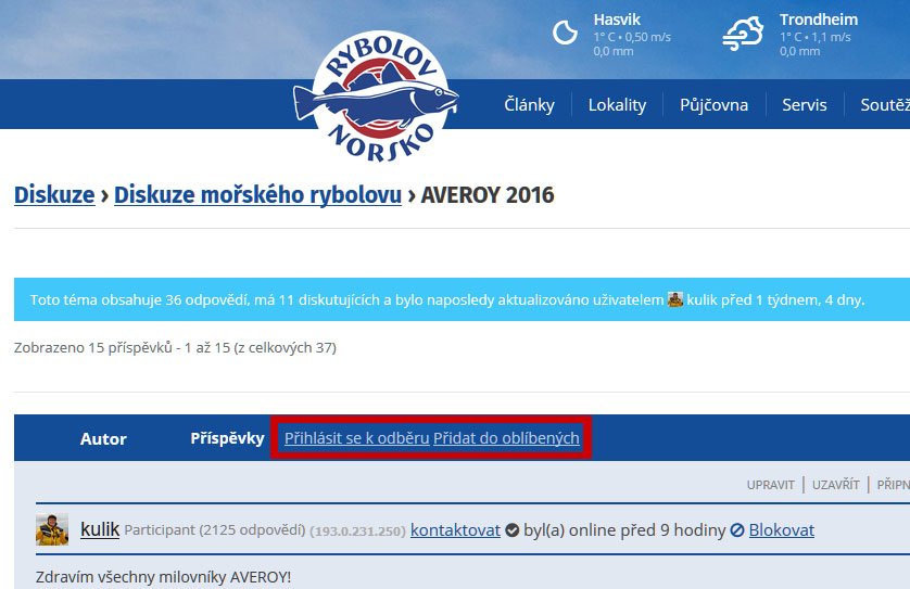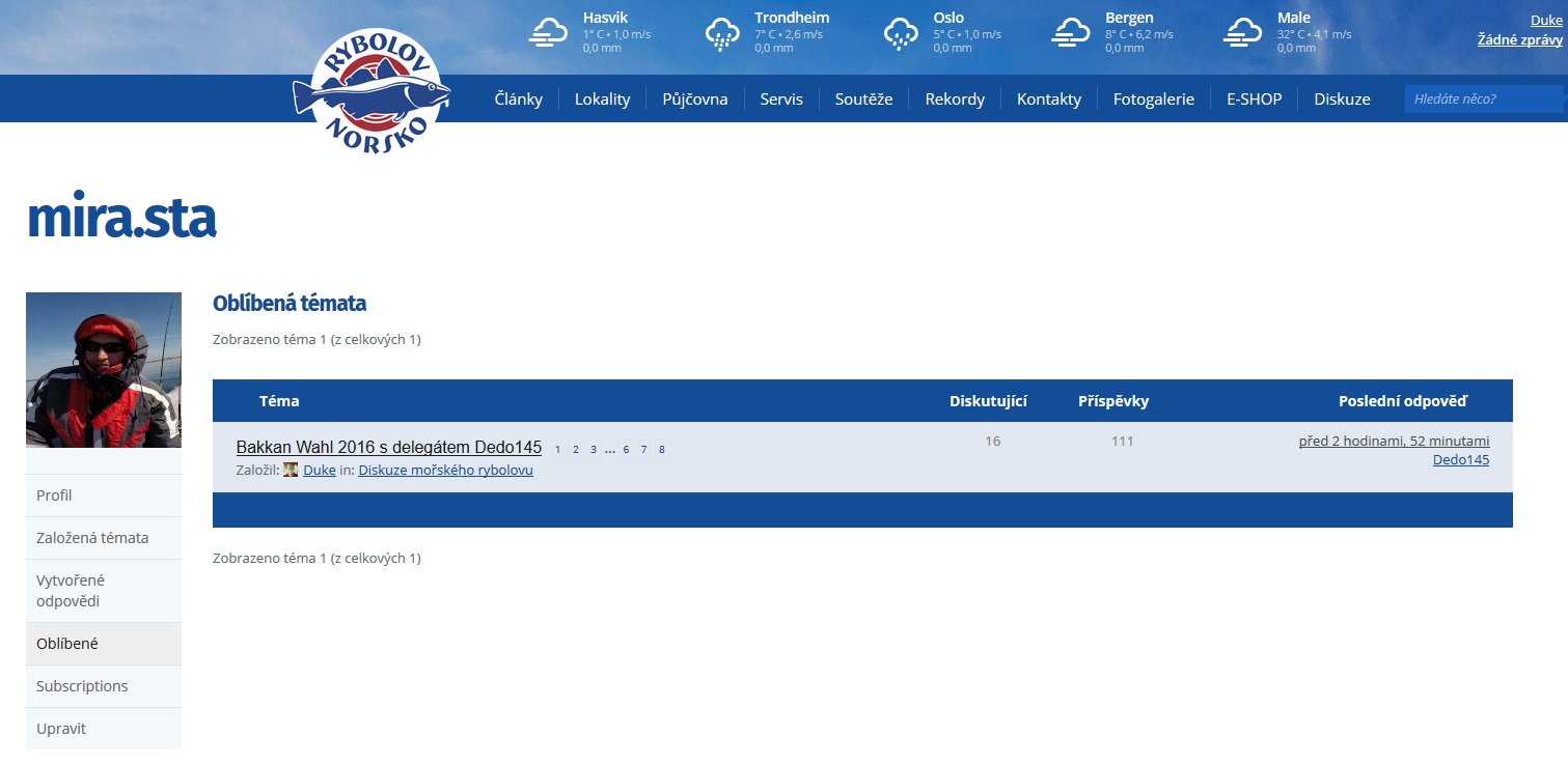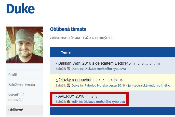 DukeSprávceTak proč si témata které Vás zajímají nedáte do oblíbených a už nikdy je nemusíte hledat? Snadno se k nim vždy dostanete. A když je v tématu poslední příspěvek vložen před týdnem a půl, tak by Vám „Posledních 24 hodin“ stejně nepomohlo. Téma se nyní nachází na druhé straně „Diskuze mořského rybolovu“ cca v polovině.
