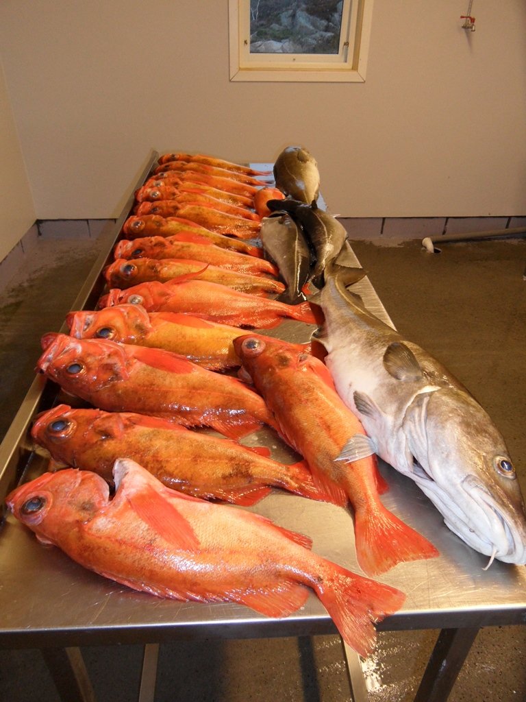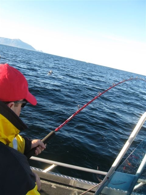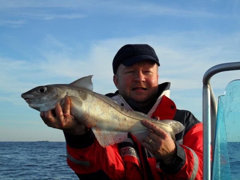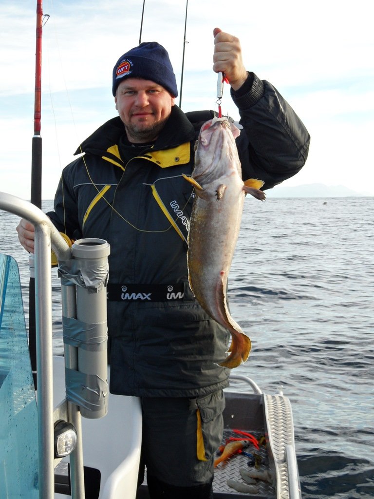 Dneska se od rána počasí jenom smálo. Vypluli jsme za úsvitu směr severní pól. V pohodě jsme se celý den pohybovali na otevřeném moři v místech doporučovaných domorodci. Všude mraky malých kelerů, ale velký ani jeden. Byly pod nimy jenom 60 – 80 obecné. Stejně jak brosmy taky jsou naprosto všude. Větší obecné byly na hranách mezi 60 až 80 metry, cca 10m nade dnem. Několik pěkných devadesátek se tam povedlo. Zítra to vypadá až na podvečerní výjezd, možná dopoledne zkusíme pstruhy.[/citace]